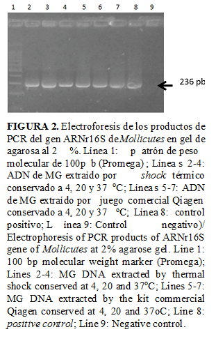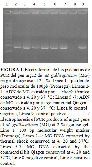 Por otra parte, se demuestra que a partir del ADN que se obtuvo con los dos métodos de extracción de ácidos nucleicos, se alcanzaron iguales resultados de amplificación en el estudio de estabilidad (Figuras 1 y 2). Esto se corresponde con lo reportado por otros autores (31,32), quienes describen que no es necesario tener un ADN puro, es decir, expuesto o libre de material celular para que se pueda detectar por esta técnica, sino que lo más importante es el empleo de cebadores que reconozcan una región específica del ADN de estos microorganismos. Esto ofrece la ventaja de tener como alternativa, para el diagnóstico de M. gallisepticum, un método rápido de extracción de ADN con la calidad requerida del material genético.