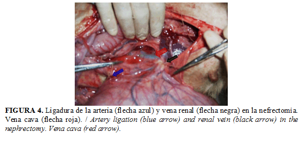 El riñón derecho tenía apariencia y tamaño fisiológico; la cápsula tenía abundantes vasos ramificados, pero el izquierdo no se encontraba; por otra parte, el ovario izquierdo se encontraba fuertemente unido a esta masa (Fig. 3) y, como este se une por el ligamento suspensorio al polo posterior del riñón (1), no había dudas que esta gran masa contenía al riñón izquierdo o era el mismo, porque de ella emergían una arteria (renal) y una vena (renal) dirigiéndose ambas a la arteria aorta abdominal y la vena cava posterior, respectivamente (Fig. 4).