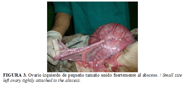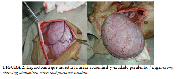 En el preoperatorio se estabilizó a la paciente con fluidoterapia atemperada (370 C). Se premedicó con sulfato de atropina (0,022 mg/kg), seguido de Zoletil 100 (Zolazepan + Tiletamida) a una dosis de 0,1 mg/kg, vía endovenosa. Al proceder con la celiotomía, con una incisión de 10 cm, se evidenció la masa gigante que se había detectado a la palpación y el flujo purulento (Fig. 2). La incisión se agrandó para definir qué era esta masa y/o cuál era su origen.
