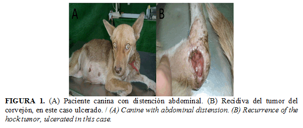 La paciente canina era hembra mestiza entera, de dos años de edad y un peso vivo de 6,4 kg. Durante la anamnesis la propietaria argumentó que su mascota había sido sometida, cuatro meses atrás, a un procedimiento quirúrgico, en el que se le realizó la resección de una masa tumoral (sin estudio histopatológico) en la región del corvejón izquierdo. Al tiempo presentó una gestación, con un parto de nueve cachorros, que nacieron muertos. Junto con la gestación se desarrolló nuevamente el tumor del corvejón. Después del parto, el abdomen comenzó a crecer.